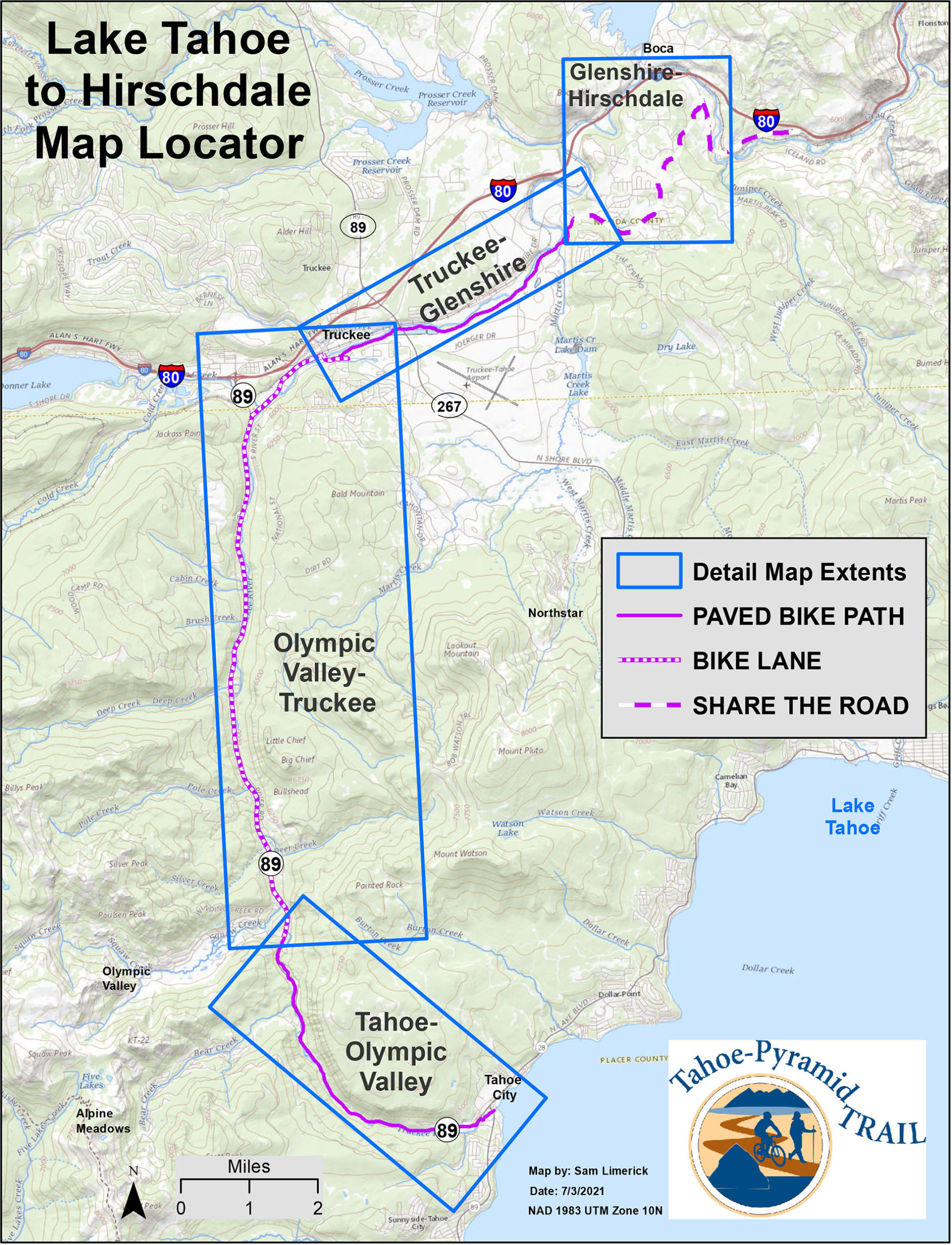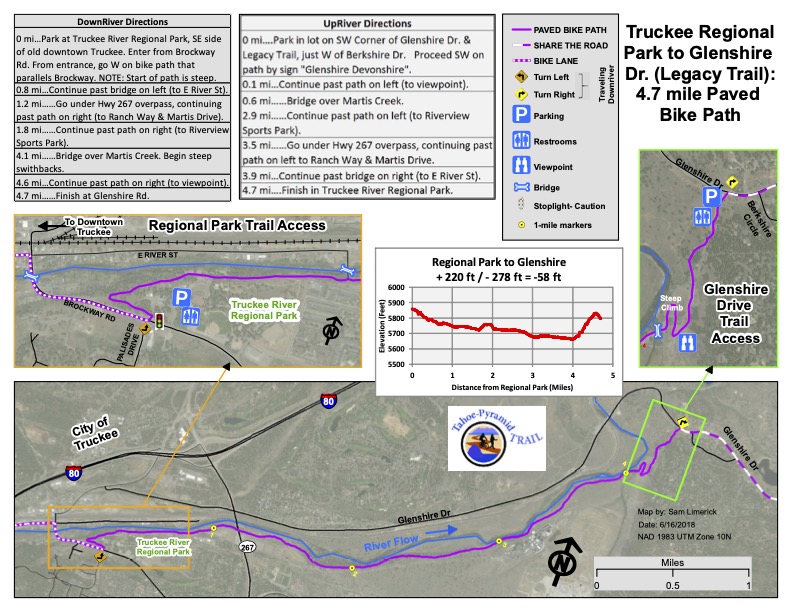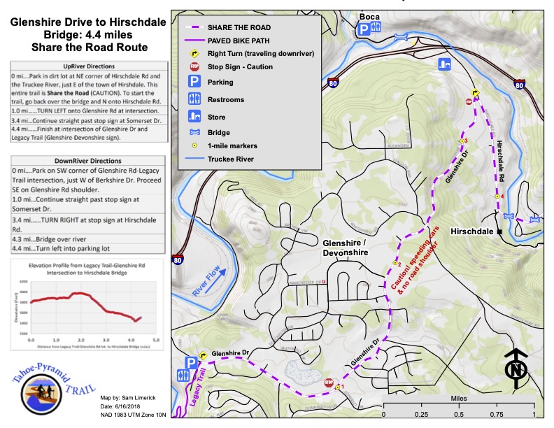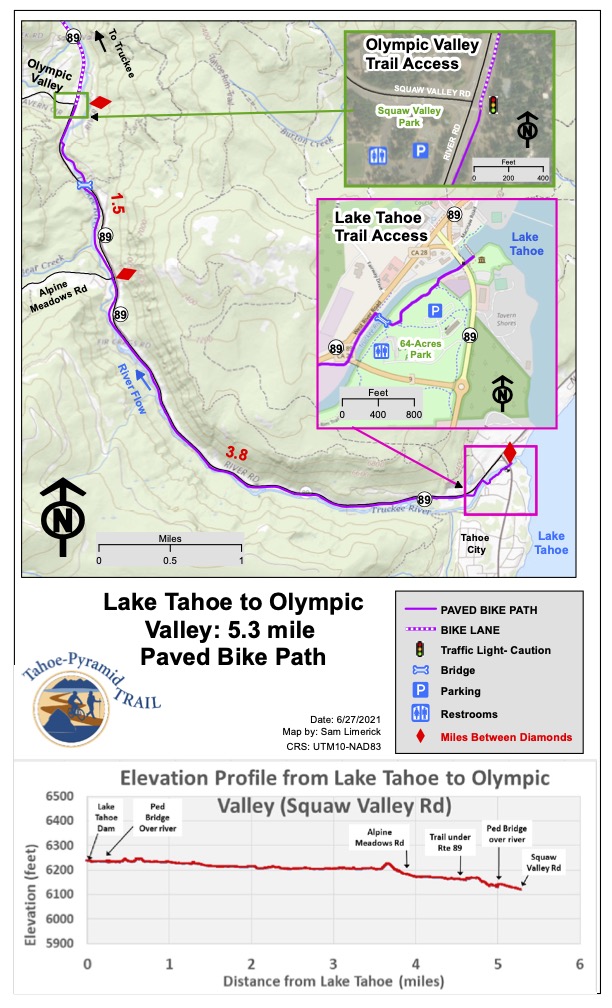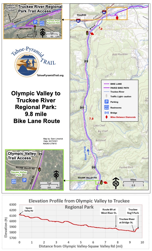The Trail starts with a paved separate multi-use path from Tahoe City to Squaw Valley (5 miles) which is heavily used in the summer. At Squaw Valley the trail transitions to a wide bike lane alongside Highway 89 to Truckee. In Truckee, the use of West River Street and Bridge St / Brockway Rd connects with the Truckee Legacy Trail to Glenshire. Following Glenshire Drive leads downhill to Hirschdale and the Truckee River Canyon. The gradient of the Tahoe City to Hirschdale section is very gradual to nearly flat except the last section that climbs to Glenshire Drive then downhill to Hirschdale road and the Truckee River bridge.